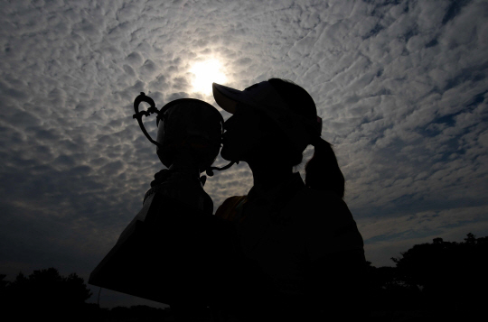S-OIL 챔피언스 인비테이셔널에서 우승을 차지한 전인지가 트로피에 키스하고 있다. 사진제공=KLPGA