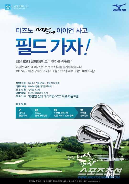 한국미즈노가 다음달 31일까지 '미즈노 MP-54 아이언 사고 필드 가자!' 이벤트를 진행한다. MP-54아이언 구매고객에게 그린피를 지원하는 특별한 이벤트다. 해당 기간 내 미즈노 MP-54 아이언 구매 고객 중 선착순 400명을 대상으로 30만 원 상당의 전국 레이크힐스CC 무료 라운드권(카트피, 캐디피 본인 부담)을 증정한다. 이 라운드권은 용인, 제주, 순천, 경남 등 전국 레이크힐스CC에서 사용 가능하다. 참여방법은 간단하다. 2014년형 미즈노 MP-54 아이언 구매 후 미즈노 공식 홈페이지(www.mizuno.co.kr)에 정품바코드와 이벤트 번호를 등록하면 참여가 된다. 당첨자는 미즈노 홈페이지에서 확인 가능하다. 한편 중-상급자 로우핸디 골퍼를 위한 MP-54 아이언은 세계특허 기술인 미즈노만의 연철 단조제조공법인 '그레인 플로우 포지드(Grain Flow Forged)'로 궁극의 타구감을 실현하는 동시에 언더컷 캐비티 설계로 미스샷을 줄여 방향 안정성을 높였다. 번호에 따른 플로 캐비티 설계로 어떠한 라이에서도 안정적인 탄도 실현한 것이 특징이다. 타깃 골퍼에 부합하는 탄도와 뛰어난 스핀컨트롤 성능 역시 MP-54만의 장점이다.