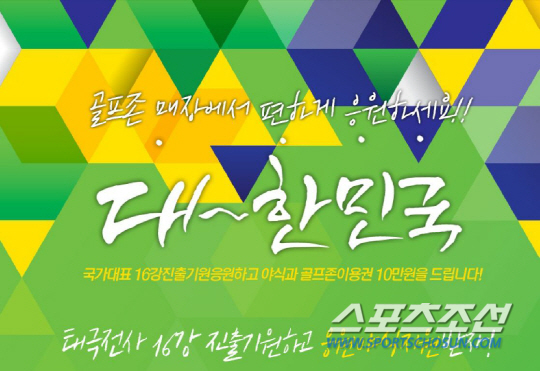 골프존이 브라질 월드컵에서 대한민국의 16강 진출을 기원하는 고객들에게 야식을 지원하는 '골프존과 대~한민국' 이벤트를 실시한다. 야식 지원 이벤트는 23일 알제리전과 27일 벨기에전 응원을 위해 골프존 '야식지원매장'에서 축구 중계를 시청하는 고객에게 피자나 치킨 등 응원 음식을 제공한다. 야식을 제공하는 매장은 전국 골프존 비전이나 리얼이 설치된 스크린골프 매장으로 지난 10일까지 접수를 받은 460여개 매장 중 추첨을 통해 160곳을 선정했다. 해당 매장은 골프존닷컴(www.golfzon.com)홈페이지를 통해 확인하면 된다.