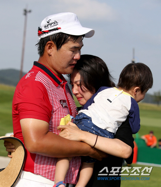8년만에 생애 첫 우승을 차지한 주흥철이 18번홀 그린에서 기다리던 아내와 아들을 끌어안으며 하염없이 눈물을 흘리고 있다. 사진제공=KPGA