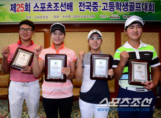 시상식에서 남고부 우승 김성현(창원사파고), 여고부 우승 허현주(상당고), 여중부 우승 이소라(세정중), 남중부 우승 고군택(남원중)이 포즈를 취하고 있다(왼쪽부터). 나주=송정헌 기자 songs@sportschosun.com/2014.07.04
