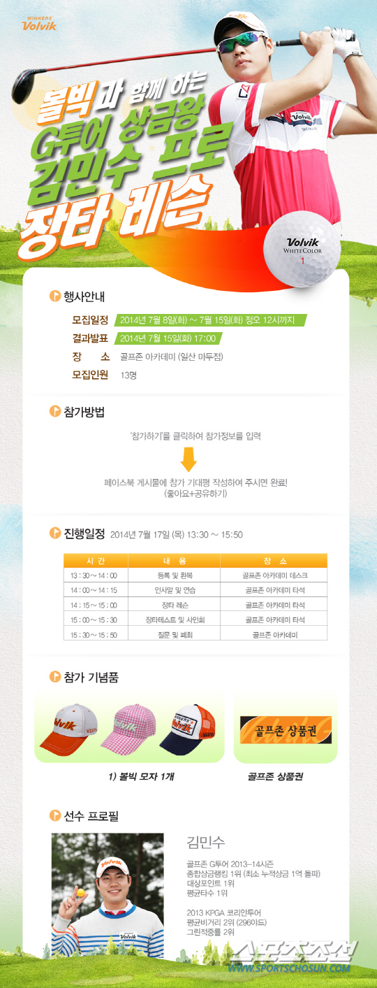 볼빅은 오는 17일(목) 경기도 일산동구 마두동에 위치한 골프존 아카데미 일산 마두점에서 오후 1시 30분부터 오후 3시 50분까지 김민수 장타 이벤트를 마련한다. 김민수는 2013 KPGA 코리안투어 평균 드라이버 거리 1위를 기록한 김태훈(297.094야드)과 근소한 차이로 2위(296.594)를 기록했다. 그린 적중률 부문에서도 80.769%로 2위에 오르며 장타자로서의 자존심을 살렸다. 볼빅은 현재 장타 레슨 참가자를 모집 중이다. 모집인원은 13명이며 볼빅 홈페이지(http://www.volvik.co.kr)를 통해 신청할 수 있다. 참가 신청은 15일(화) 정오까지 신청 받으며 참가자들에게는 볼빅 2014년 신상품 모자와 골프존 상품권 등 소정의 기념품이 수여된다.