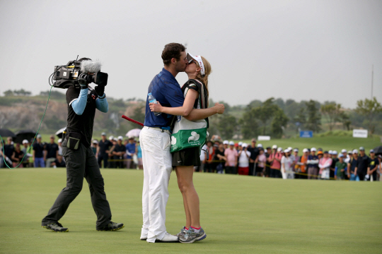 KPGA 선수권대회에서 우승을 확정한 뒤 여자친구이자 캐디인 엘리자베스와 키스를 하고 있는 매슈 그리핀. 사진제공=KPGA