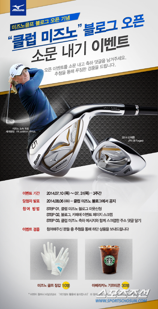 한국미즈노(www.mizuno.co.kr)가 고객과의 원활한 소통의 장과 다양하고 깊이 있는 정보를 제공하기 위하여 미즈노골프 공식 블로그인 클럽 미즈노(www.clubmizuno.co.kr)를 오픈했다. 한국미즈노는 공식 블로그 오픈을 기념해 푸짐한 경품을 증정하는 클럽 미즈노 블로그 오픈 소문내기 이벤트를 진행한다. 오는 7월31일까지 미즈노골프 공식 블로그인 클럽 미즈노에서 진행하는 이번 이벤트의 참여 방법은 간단하다. 미즈노골프 공식 블로그인 클럽 미즈노를 이웃으로 추가하는 동시에, 블로그와 카페 등에 해당 이벤트 페이지를 스크랩해 클럽 미즈노 오픈 축하 메시지와 함께 댓글을 달면 응모가 완료된다. 이벤트에 참가한 응모자 중 40명을 추첨해 미즈노 골프 장갑 등 푸짐한 경품을 증정한다. 당첨자 발표는 클럽 미즈노 블로그를 통해 8월6일 확인할 수 있다.