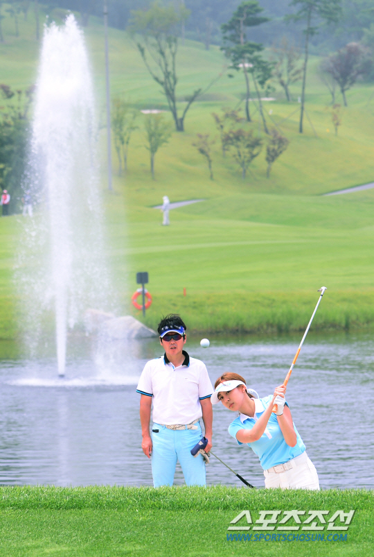 박지영 아나운서가 이경철 교수가 지켜보는 가운데 파3홀에서 아이언 티샷을 하고 있다. 안성=조병관기자 rainmaker@sportschosun.com