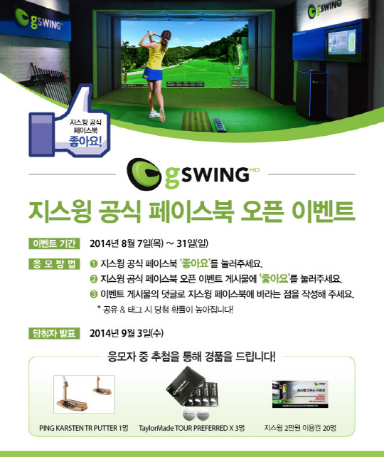 게임소마는 지스윙 공식 페이스북을 통해 고객들에게 지스윙 뉴스, 골프 정보 등 유용한 컨텐츠를 제공하고 고객과 직접적인 소통 강화에 나설 예정이다. 페이스북 오픈 이벤트 응모 방법은 지스윙 페이스북 페이지와 해당 이벤트 게시물에 모두 '좋아요'를 누르고, 이벤트 게시물의 댓글로 지스윙 페이스북에 바라는 점을 한 가지 이상 올리면 이벤트에 자동 응모된다. 또한 이벤트 게시물을 공유할 경우 당첨 확률이 높아진다. 추첨을 통해 선정된 당첨자에게는 핑 퍼터, 테일러메이드 골프공, 지스윙 이용권 등 다양한 경품을 제공한다. 당첨자는 9월 3일(수) 지스윙 공식 페이스북과 블로그(http://blog.naver.com/g_swing)에 공지할 예정이다.