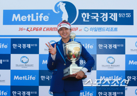 | KLPGA 챔피언십에서 우승을 차지한 백규정이 트로피를 들고 시즌 3승의 의미로 세 손가락을 펴보이고 있다. 사진제공=KLPGA |