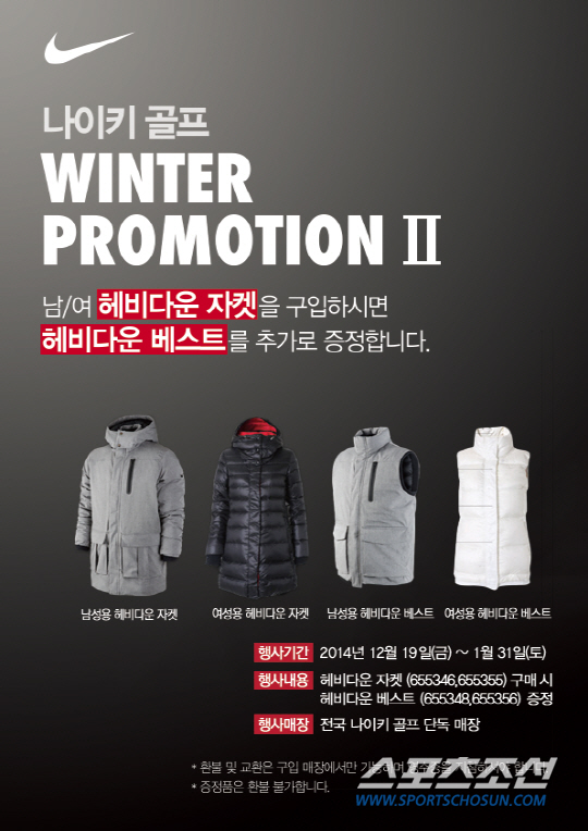 나이키 골프가 내년 1월 31일까지 '윈터 프로모션2' 이벤트를 실시한다. 이번 이벤트는 헤비다운 재킷 구매 시 30만원 상당의 헤비다운 베스트를 증정하는 형식으로 백화점을 포함한 전국 나이키 골프 단독 매장에서 진행한다.