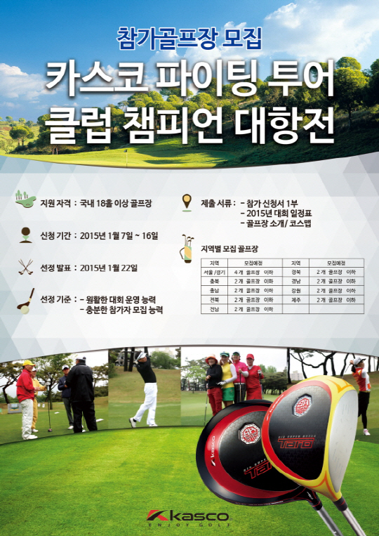 한국카스코㈜(www.kascogolf.co.kr)가 전국 골프장별 아마추어 최강자를 가리는 '2015 카스코 파이팅 투어 클럽 챔피언 대항전'에 참가할 골프장을 모집한다. 2015 카스코 파이팅 투어 클럽 챔피언 대항전은 상반기(3~7월) 개인전과 하반기(7~11월) 단체전으로 진행될 예정이다. 각 골프장에서 4번의 예선을 거쳐 선발된 대표 선수 2팀은 결승전에서 전국 최강 클럽 챔피언을 겨루게 되며 전국 결승전은 모두 방송으로 중계된다.