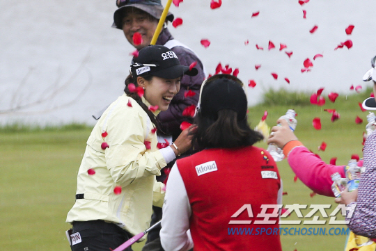 김보경이 KLPGA 투어 개막전인 롯데마트 여자오픈에서 우승을 확정짓자 동료들이 꽃잎을 뿌리며 축하해 주고 있다, 사진제공=KLPGA