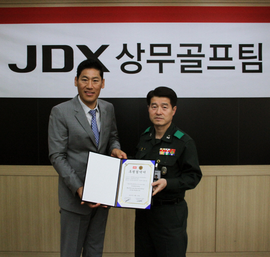 JDX는 15일 경북 문경의 국군체육부대에서 상무 골프단과 함께 스폰서십 협약식을 진행했다. 이로써 JDX상무 골프단 선수들은 JDX로고가 새겨진 의류와 용품을 착용하고 경기에 출전하게 된다.