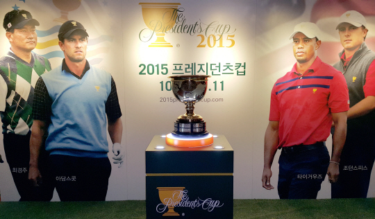 프레지던츠컵 트로피가 국내 골프 팬들을 찾아간다. 지난 25일 2015 프레지던츠컵 개최지인 인천 송도 잭 니클라우스 골프클럽 코리아에 전시됐다.