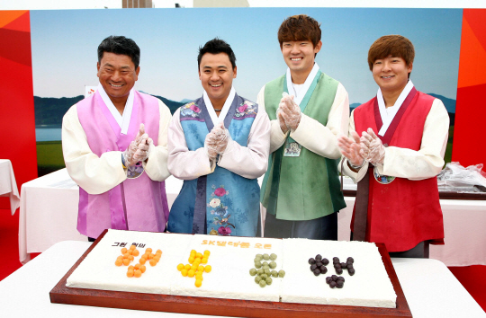 21일 개막하는 SK텔레콤 오픈에 앞서 19일 공식포토콜 행사에서 최경주, 박상현, 김비오, 김승혁(왼쪽부터) 등이 한복을 입고 포즈를 취하고 있다. 사진제공=SK텔레콤