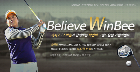 던롭스포츠코리아는 젝시오8 클럽과 스릭슨 Z-STAR 볼을 사용하는 박인비의 커리어 그랜드슬램 달성을 기원하는 'Believe WinBee' 이벤트를 홈페이지에서 진행한다. 오는 30일 열리는 미국여자프로골프(LPGA) 투어 리코 브리티시 여자오픈에서 커리어 그랜드슬램 달성에 도전하는 박인비가 사용하는 클럽과 볼의 제품명을 맞히면 추첨을 통해 스릭슨 캐디백(1명), 젝시오8 페어웨이우드(1명), 스릭슨 Z-STAR 볼 1더즌(5명)을 증정한다. 이벤트는 8월 2일(일)까지 진행되며, 당첨자 발표는 8월 5일이다.