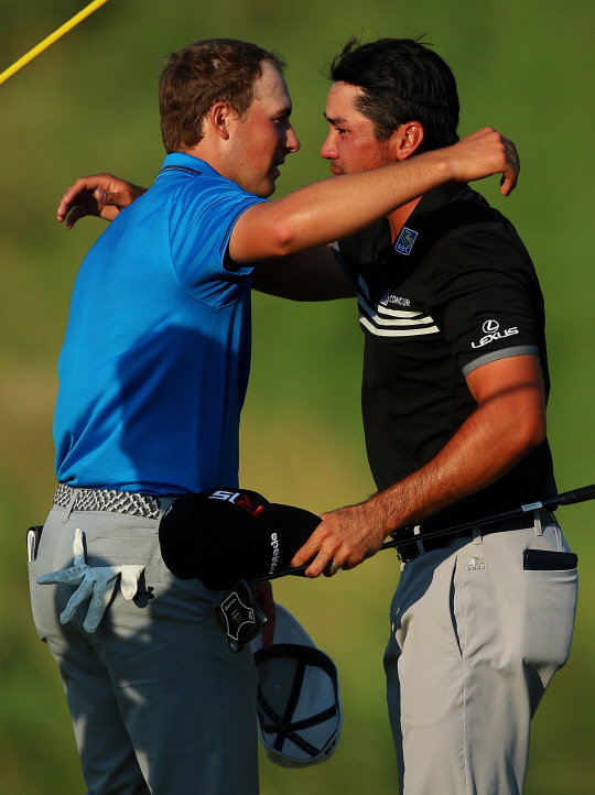 SHEBOYGAN, WI - AUGUST 16: Jordan Spieth of the United States greets Jason Day of Australia after Day's three-stroke victory at the 2015 PGA Championship at Whistling Straits on August 16, 2015 in Sheboygan, Wisconsin. Andrew Redington/Getty Images/AFP