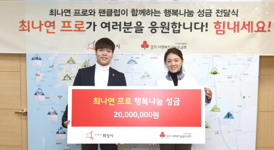 최나연(27)이 팬클럽과 함께 모은 성금을 '로봇다리 수영왕'으로 알려진 김세진(17세)에게 전달했다. 최나연은 경기 아너 소사이어티(1억원 이상 개인 고액기부자 모임) 회원이다. 최나연은 지난 6일 팬미팅과 더불어 '팬들과 함께하는 자선경매' 행사를 진행했다. 이날 팬클럽에서 모은 3000만원과 최나연이 3000만원을 더해 총 6000만원의 기부금을 조성했다. 기부금의 사용처를 고민하던 중 어려운 상황에도 꿈을 키우기 위해 노력하는 김세진의 소식을 듣고 이 중 2000만원을 전달했다.