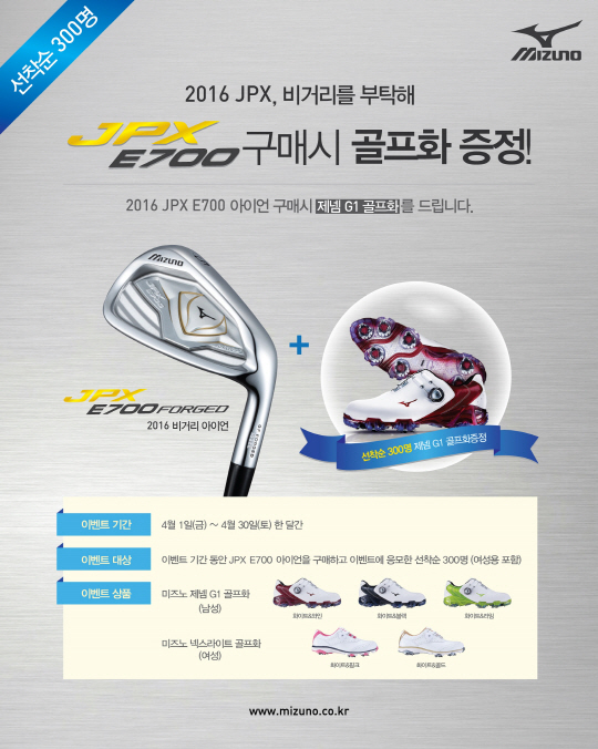 한국미즈노는 2016년 신제품 JPX E700 포지드 아이언의 출시를 기념해 오는 4월 30일까지 'JPX E700 포지드 아이언, 비거리를 부탁해!' 이벤트를 진행한다. 이번 행사는 더 쉽게, 더 멀리를 컨셉트로 출시된 비거리 특화 아이언 JPX E700 포지드를 구매하면 안정적인 접지력과 착화감의 퍼포먼스형 신제품 골프화 제넴 G1을 증정하는 내용이다. 미즈노의 JPX E700 포지드 아이언의 구매고객은 누구나 미즈노 홈페이지(www.mizuno.co.kr)에서 간단히 참여 가능하다. 4월 1일부터 미즈노 정식 대리점에서 구매한 JPX E700 포지드 아이언 샤프트에 부착된 미즈노 정품 홀로그램 시리얼 넘버 16자리를 미즈노 홈페이지에 입력, 정품 인증 등록을 하면 이벤트에 참여, 신청된다. 참여한 고객 선착순 300명에게 증정하는 퍼포먼스형 신제품 골프화 제넴(GENEM) G1은 미즈노 110년의 헤리티지와 슈즈 테크놀로지를 담은 미즈노 최고급 골프화이다.