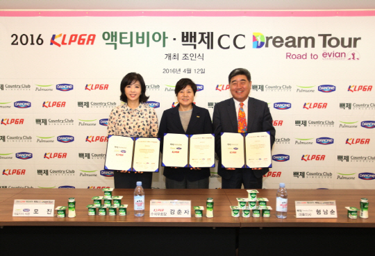 한국여자프로골프협회(KLPGA)는 12일 서울 강남구 KLPGA 사무국에서 2016 액티비아-백제CC 드림투어 조인식을 개최했다. 유산균 제품 브랜드인 액티비아를 판매하는 풀무원다논과 충남 부여의 백제 컨트리클럽은 2부 투어인 드림투어 10차전부터 14차전까지 주최한다. 1∼14차전까지 상금 1위를 차지한 선수에게는 오는 8월 열리는 미국여자프로골프(LPGA) 투어 메이저대회 에비앙 챔피언십 출전권을 준다.