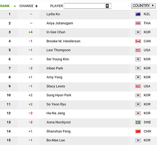 세계랭킹 1위는 여전히 리디아 고(19), 2위는 에리야 주타누간(태국)이다.