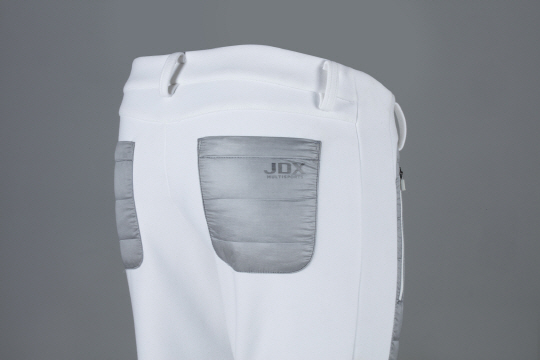 앞쪽에는 디튜브 소재로 보온성을 높였으며 뒷쪽에는 본딩프린트의 우븐 원단을 사용, 앉았다 일어났다 하는 동작이 많은 골프 종목에서 불편함을 없애고 우븐 안쪽원단에는 기모 처리를 하여 보온성을 높였다.
