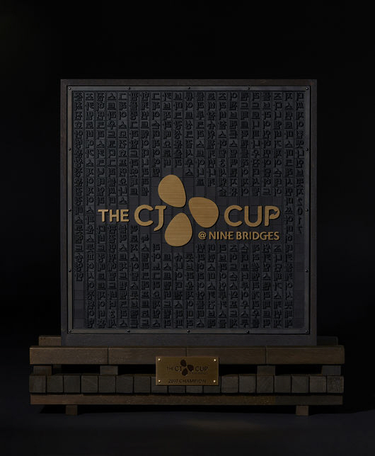 | 출전선수 명단이 모두 새겨진 더CJ컵@나인브릿지 우승 트로피. CJ제공 |