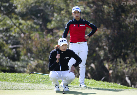 | 김민선5와 최혜용  6번홀 그린을 살피고 있다 |
