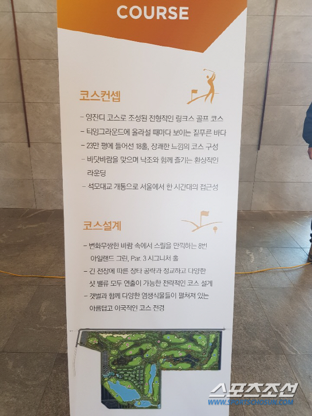 평지 골프장 답게 넓지만 곳곳에 도전적 요소가 도사리고 있다. 스카이72 하늘코스와 웰링턴CC를 설계한 노준택 설계사가 코스 공략의 재미를 느낄 수 있도록 정교하게 디자인 했다. 양잔디와 119개의 벙커로 이뤄진 코스는 긴 전장에 따른 시원한 장타 공략은 물론 다양한 샷을 모두 구사할 수 있도록 꾸며져 있다. 특히 인코스 8번 아일랜드 그린은 변화무쌍한 바람과 워터 헤저드를 극복해야 하는 파3 시그너처 홀이다.