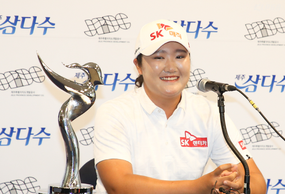 11일 제주 오라 컨트리클럽에서 열릴 예정이었던 KLPGA 투어 제주 삼다수 마스터스 최종라운드가 악천우로 취소되면서 유해란이 우승 인터뷰를 하고 있다.. 사진제공=KLPGA