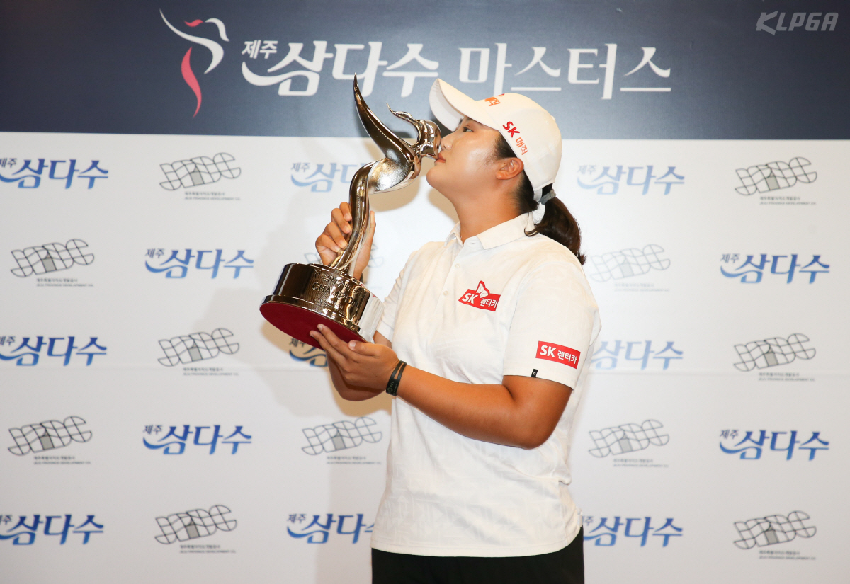 11일 제주 오라 컨트리클럽에서 열릴 예정이었던 KLPGA 투어 제주 삼다수 마스터스 최종라운드가 악천우로 취소되면서 우승 트로피에 입 맞추고 있는 유해란. 사진제공=KLPGA