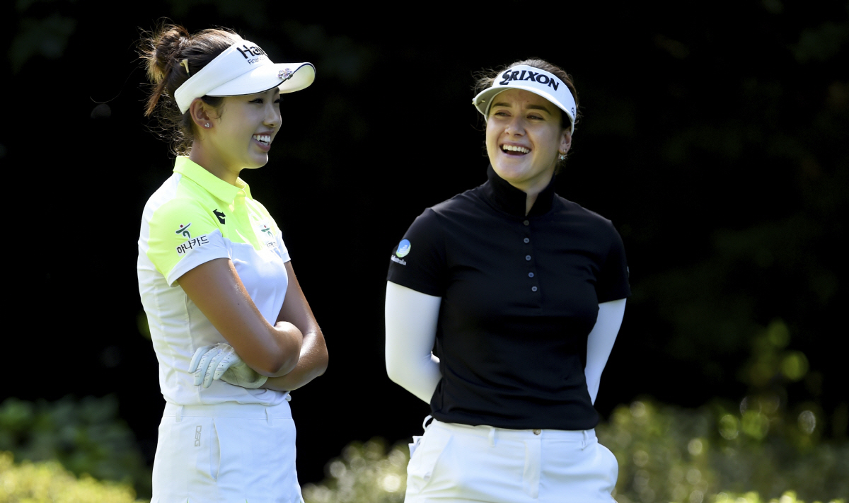 Yealimi Noh, left, and Hannah Green of Australia (R) chat as they wait to hit their tee shots on the fifth hole during the final round of the LPGA Cambia Portland Classic golf tournament in Portland, Ore., Sunday, Sept. 1, 2019. (AP Photo/Steve Dykes) <저작권자(c) 연합뉴스, 무단 전재-재배포 금지>