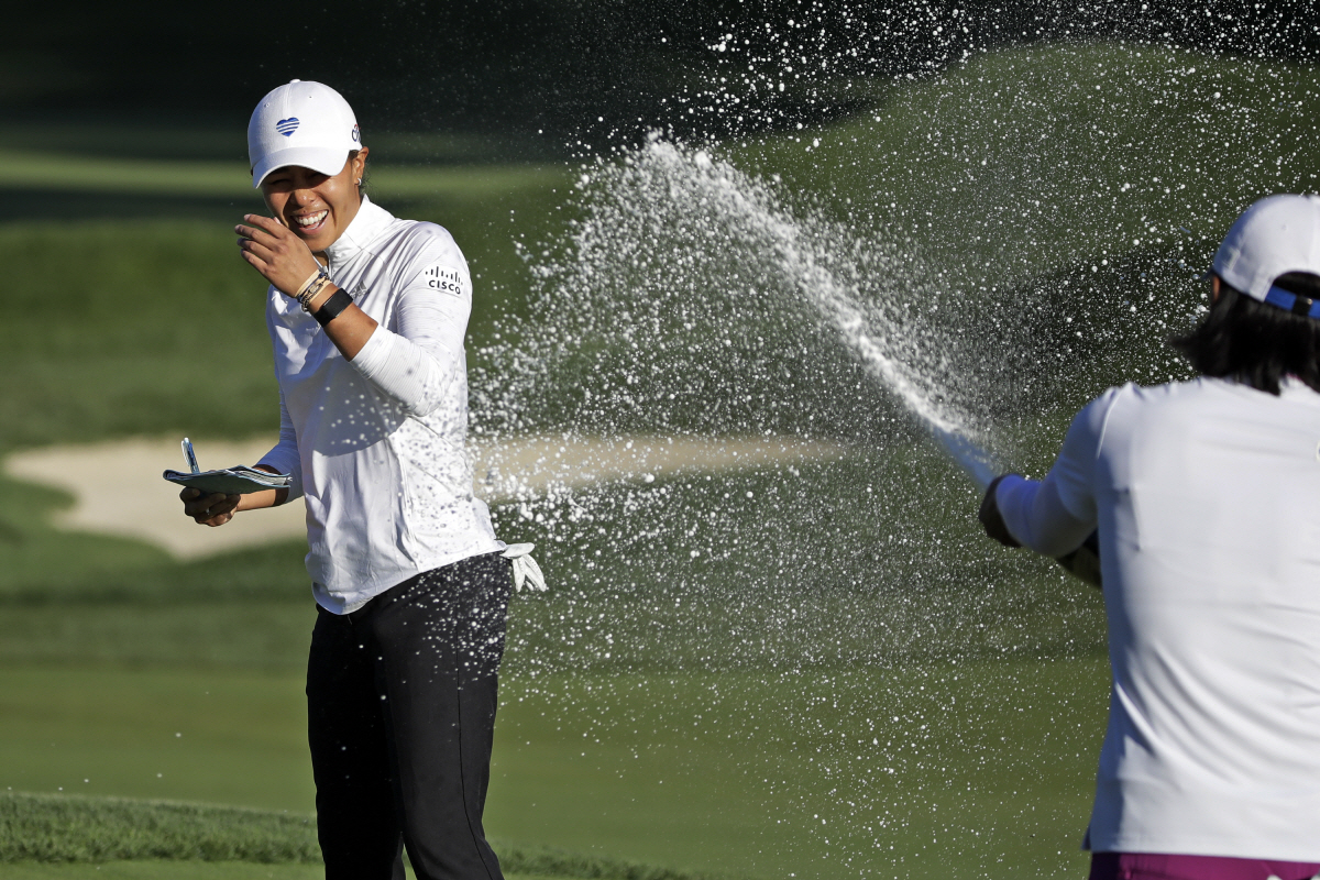 Danielle Kang gets a champagne shower after winning the LPGA Drive On Championship golf tournament Sunday, Aug. 2, 2020 at Inverness Club in Toledo, Ohio. Kang won the tournament by one stroke over Celine Boutier, of France. (AP Photo/Gene J. Puskar) 연합뉴스