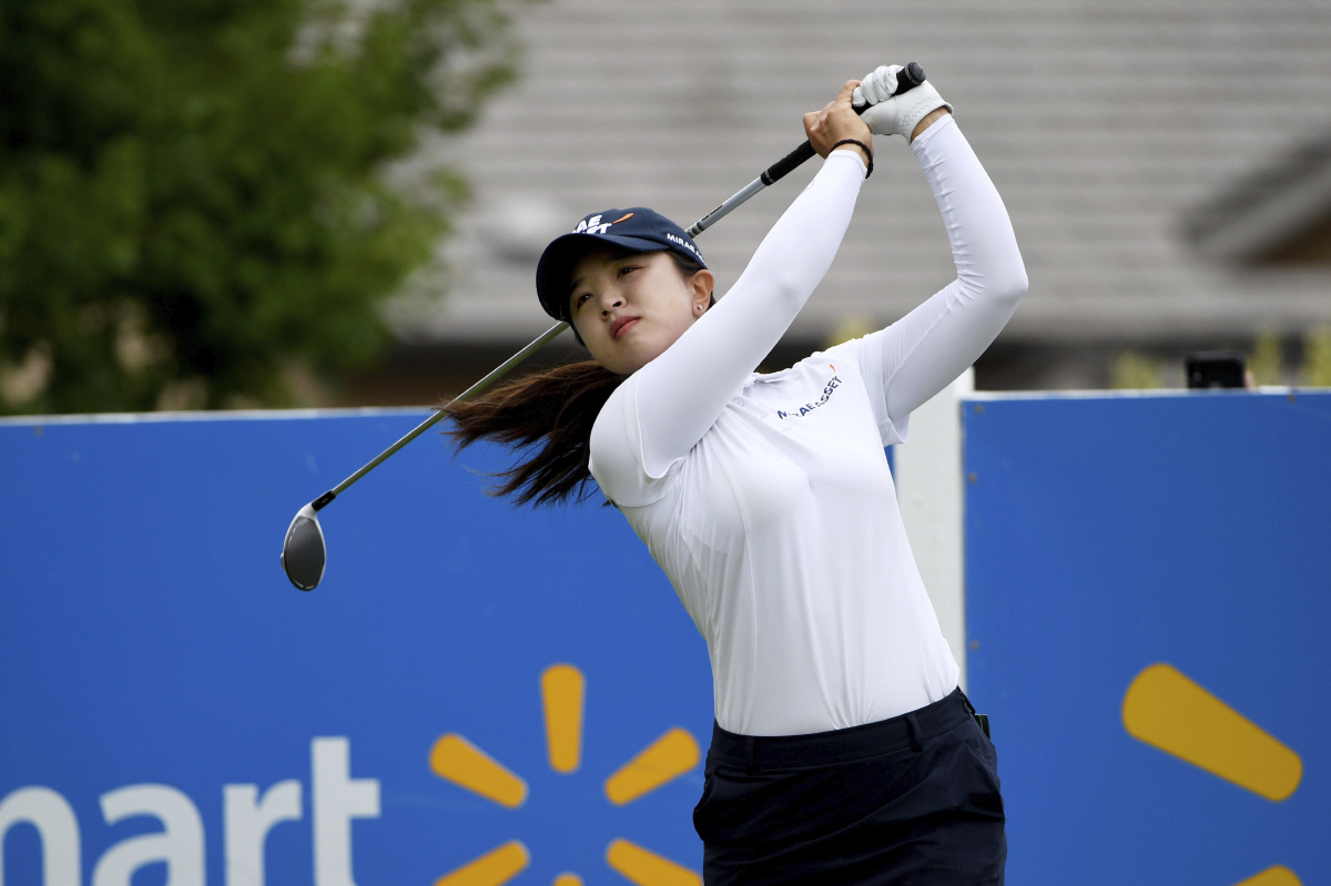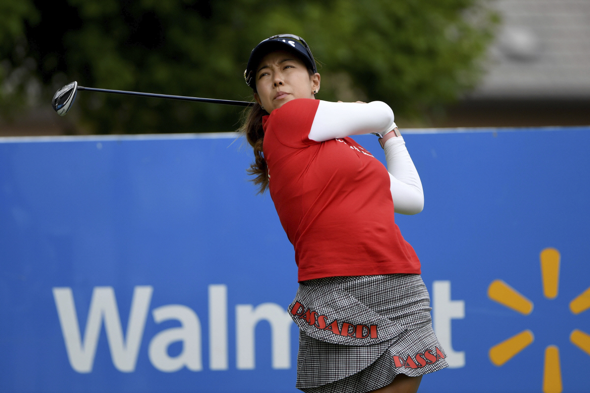 Jenny Shin, of South Korea, watches her tee shot on the first hole during the final round of the LPGA Walmart NW Arkansas Championship golf tournament, Sunday, Aug. 30, 2020, in Rogers, Ark. (AP Photo/Michael Woods) AP연합뉴스