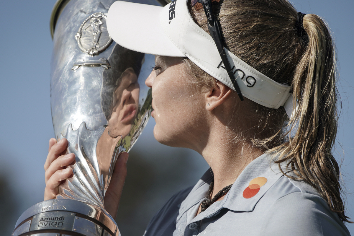 Brooke Henderson, of Canada, kisses with her trophy after winning the Evian Championship women's golf tournament in Evian, eastern France, Sunday, July 24, 2022. (AP Photo/Laurent Cipriani)