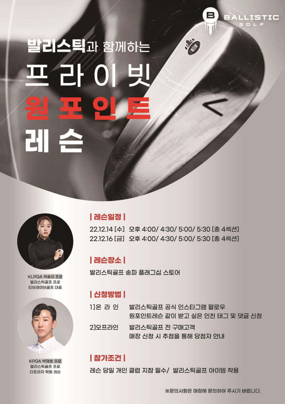 프리미엄 골프 브랜드 발리스틱골프(BALLISTIC GOLF)가 다음달 14일, 16일 양일간 발리스틱골프 송파 플래그십 스토어에서 소속 프로와 함께하는 '프라이빗 원포인트 레슨'을 진행한다.
