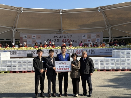 (서울=연합뉴스) 김동찬 기자 = 골프존그룹이 그룹사 사회공헌 활동인 '스윙 유어 드림'의 하나로 12일 대전 유성구 사랑의 김장 나누기에 동참했다고 13일 밝혔다.