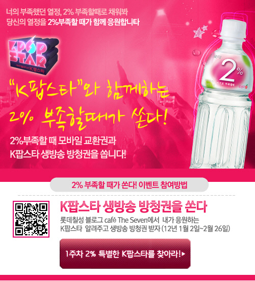 2월 26일까지 총 7회에 걸쳐 진행될 예정이며, 매주 진행되는 방송을 보고 롯데칠성음료 블로그(www.chilsungblog.com)에서 방송과 관련된 간단한 댓글 이벤트에 참여하면 된다. 이벤트에 참여한 응모자 중 추첨을 통해 K팝스타 시청자들이 가장 원하는 상품인 생방송 방청권과 '2%부족할 때' 모바일 상품권 등을 증정한다.