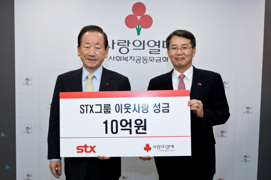 STX그룹이 사회복지공동모금회에 성금 10억 원을 전달하며 소외계층과 사회복지시설 지원에 적극 나섰다. STX그룹은 11일 서울 중구 사회복지공동모금회에서 추성엽 ㈜STX 사장, 이동건 사회복지공동모금회 회장 등 관계자 30여명이 참석한 가운데 이웃사랑 성금 10억원 전달식을 가졌다.