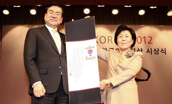 조양호 한진그룹 회장(평창동계올림픽 유치위원회 위원장)(왼쪽)이 '한국 이미지 디딤돌상'을 받은 후 최정화 한국이미지커뮤니케이션연구원 이사장과 함께 포즈를 취하고 있다.