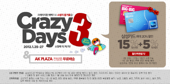 애경그룹이 운영하는 온라인쇼핑몰 AK몰(www.akmall.com)이 1월 25일부터 27일까지 3일간 크레이지 3데이즈 (Crazy 3 Days) 이벤트를 진행한다.