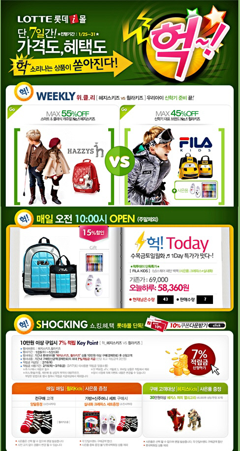 롯데홈쇼핑(대표: 신 헌, www.lotteimall.com) 인터넷쇼핑몰 롯데아이몰이 본격적인 신학기 준비시즌이 시작됨에 따라 31일(화)까지 '헤지스키즈', '휠라키즈' 등 인기 브랜드의 신학기 가방 및 의류를 최대 50% 할인 판매함과 동시에 할인 쿠폰 및 적립금 제공, 사은품 증정 등의 프로모션을 펼친다.