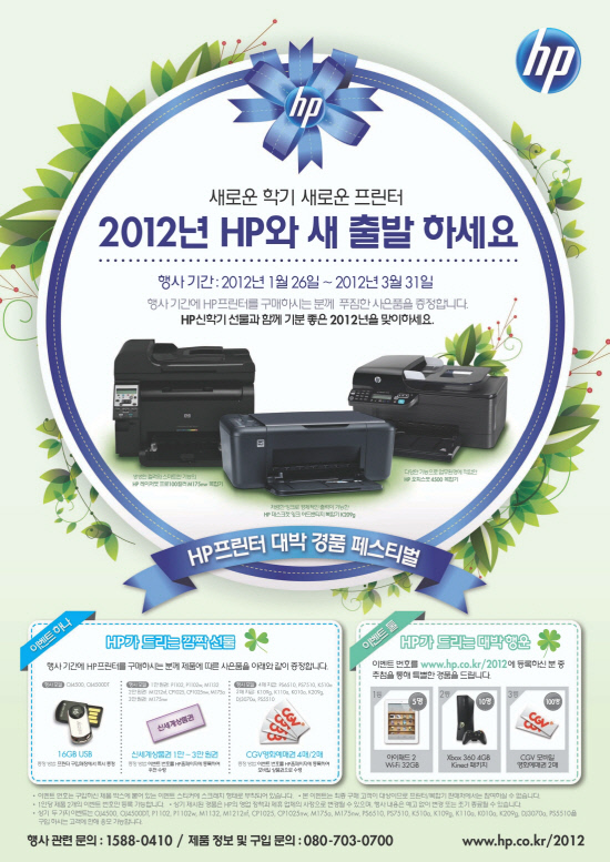 특별한 경품을 증정하는 추첨 이벤트도 동시에 진행된다. 이벤트 참가자 중 1, 2, 3등을 추첨해 아이패드2 Wi-Fi 32GB(5명), Xbox 360 Kinect 4GB 패키지(10명), CGV 모바일 영화예매권 2매(100명)을 제공한다. 프로모션은 오는 3월 31일까지 진행, 참가를 위해선 구매한 제품의 이벤트 번호를 홈페이지(www.hp.co.kr/2012)에 등록하면 된다. 보다 자세한 프로모션과 제품 정보는 홈페이지와 문의전화(1588-0410 / 080-703-0700)를 통해 확인할 수 있다.
