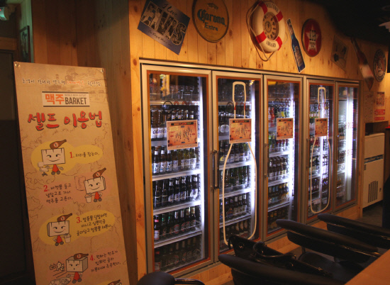 마켓에서 쇼핑을 하듯 자유로운 분위기에서 맥주를 골라 마실 수 있다. 좌석에 비치된 바구니에 먹고 싶은 세계 맥주와 얼음을 직접 담아오면 된다. '고객이 안주를 안 시켜도 OK, 직접 사와도 OK, 배달음식을 주문해도 OK'라는 3K 이성마케팅이다.