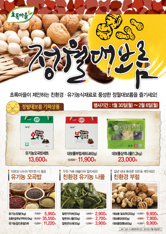 정월 대보름 음식의 대표 주자는 바로 오곡밥과 나물. 이번 제안전에서는 집에서 음식을 준비하기 어려운 맞벌이 주부들을 위해 한 가족의 한 끼 식사로 손색없는 5가지 곡식이 섞여 있어 편리하게 이용할 수 있는 유기농 오곡밥 기획세트를 특별 준비했다. 오곡밥과 함께 먹을 수 있는 친환경 유기농 나물 3종 모음은 지난 해 보다 30% 이상 할인된 가격에 장만할 수 있다. 이번 행사를 통해선 매년 12월부터 후년 3월까지 밖에 공급이 안되어 평상시 쉽게 맛볼 수 없는 울릉도 특산물 삼나물, 참고비, 부지갱이를 할인된 가격에 만나볼 수 있는 특별이벤트가 진행된다.