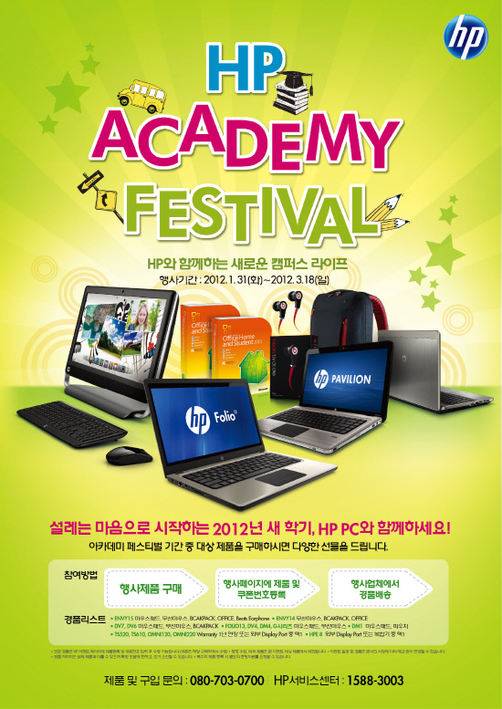 한국HP(대표 함기호)가 신학기 준비 시즌에 맞춰 3월 18일까지 'HP 아카데미 페스티벌'을 진행한다. HP 아카데미 페스티벌은 설레는 마음으로 신학기를 준비하는 고객들을 위해 준비한 행사. 행사 제품을 구매하고 행사페이지에 제품 및 쿠폰번호를 등록하면 경품 수령이 가능하다. 행사 대상 제품에는 최대 9.5시간까지 지속되는 배터리 성능을 자랑하는 울트라북 'HP Folio 13', 비츠 오디오를 탑재해 생생하고 입체적인 사운드를 구현하고 감각적인 디자인을 겸비한 'HP ENVY 15', 'HP 파빌리온 dm4 비츠 에디션' 등 HP의 최신 제품들이 다양하게 포함되어 있다. 선명한 디스플레이를 탑재하고 다양한 기능을 두루 갖춘 올인원 PC도 행사기간 중 구매하면 경품이 제공된다. 한국 퍼스널시스템그룹의 온정호 부사장은 "본격적인 졸업?입학 시즌이 되면서 신학기용 PC구입을 고려하는 고객들이 많아져 이번 행사를 기획하게 됐다"며 "한국 HP가 준비한 다양한 선물이 새로운 PC를 구매한 모든 고객들에게 유용하게 사용될 수 있길 바란다"고 밝혔다.