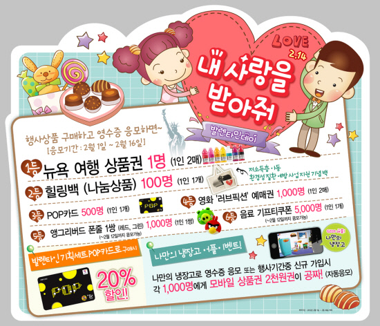 나만의 냉장고를 통해 응모하는 고객과 발렌타인 행사기간 동안 나만의 냉장고에 가입하는 고객에게는 추첨을 통해 각 1000명에게 모바일 상품권(2000원권)을 증정한다.