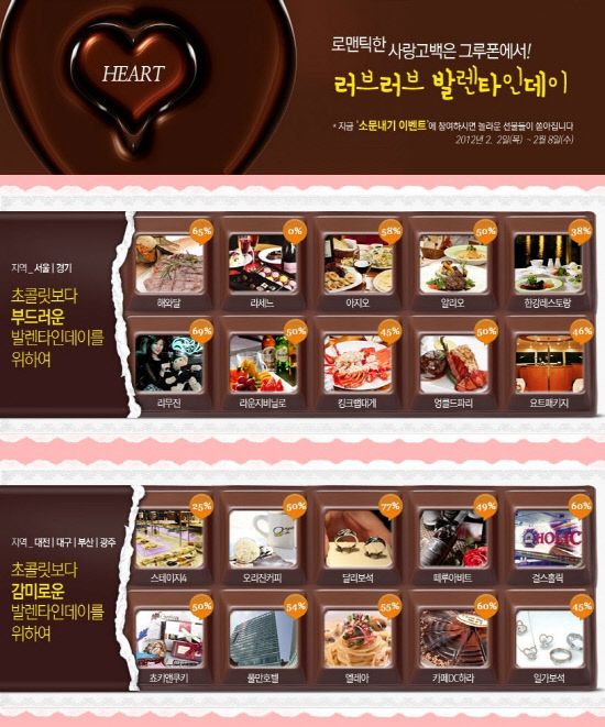 매년 찾아오는 14일의 특별한 날들. 발렌타인데이와 화이트데이를 맞아 소셜커머스업체가 분주하다. 초콜렛과 사탕을 대신할 수 있는 이색 선물을 반값에 선보이기 위해서다. 소셜커머스업계의 양대산맥인 그로폰코리아와 티켓몬스터가 야침차게 준비한 것들 중 눈여겨 볼만한 것들은 무엇이 있을까.