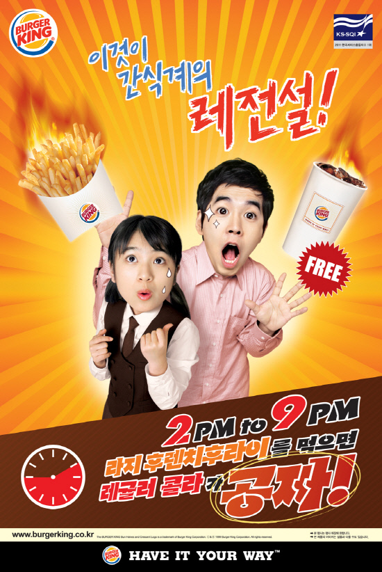 8일(수)부터 진행되는 프로모션은 오후 2시부터 9시까지 오후 시간대에 '라지 후렌치 후라이를 먹으면 레귤러 콜라가 공짜'로, 실속있는 가격에, 푸짐한 양의 간식을 즐길 수 있는 프로모션이다.