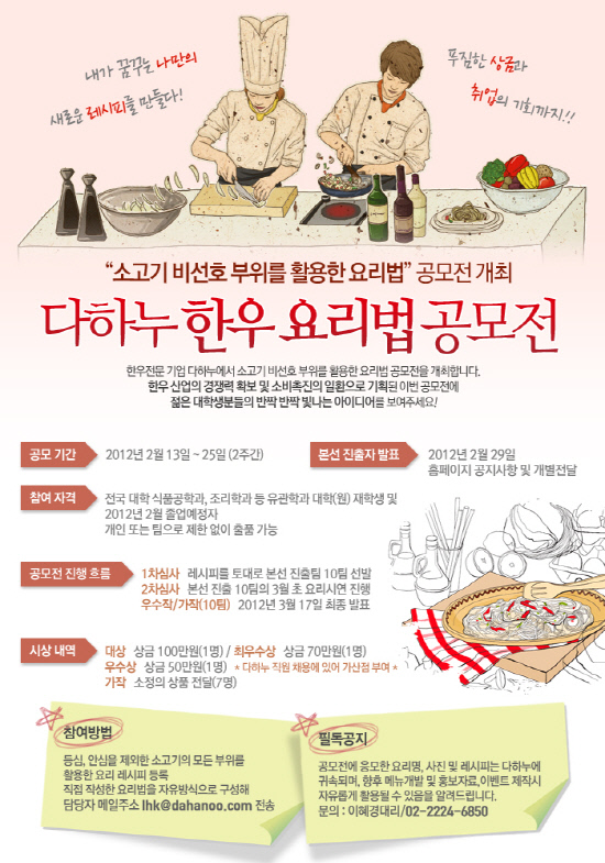 한우 대중화에 앞장서는 한우전문기업 다하누(대표 최계경)가 한우 가격 안정화 및 소비 촉진의 일환으로 대학(원)생을 대상으로 한 공모전을 개최한다.