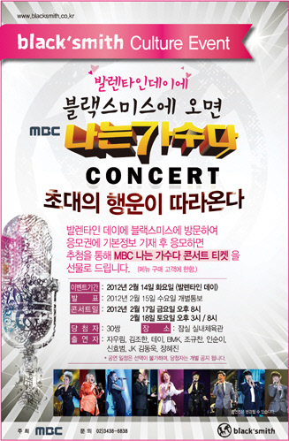 정통 이탈리안 레스토랑 블랙스미스가 발렌타인데이를 맞아 이색 이벤트를 펼친다. 블랙스미스(대표이사 김선권)는 발렌타인데이 당일에 방문하는 고객에게 '나는 가수다 콘서트' 초대권을 제공할 예정이다. '나는 가수다' 콘서트에는 인기리에 방영됐던 MBC예능프로그램 '나는 가수다' 의 출연진이었던 인순이, 장혜진, JK김동욱, 자우림, 김조한, 테이, BMK 등이 대거 출연한다.