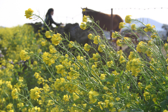 야생 유채도 곳곳에 피어나기 시작했다. 서귀포 예례동, 군산 일원의 양지바른 해안도로를 내닫다 보면 드문드문 피어난 노란 유채꽃을 만날 수 있다. 3월에 들어서면 섭지코지, 삼방산 주변을 중심으로 광활한 유채꽃 물결이 넘실댄다. 특히 이무렵 목장 주변에 펼쳐진 유채 밭은 목가적 정취가 물씬 풍긴다. 검정돌담을 경계로 샛노란 유채 밭과 초록의 초지가 이루는 색상대비가 압권이다. 특히 한가로이 풀을 뜯는 조랑말의 모습에서는 봄날의 여유를 한껏 느낄 수 있다.